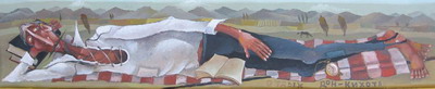 Митьки (Голубев как раз этого племени) были теми художниками, кто глубже других проник в мифологическую природу советского сознания, слепленную, как пирожок, в симпатичный анекдот. Сам образ вечно поддатого мужичка в ватнике, надетом на рваный тельничек, — чем не архетип канувшего в Лету семидесятилетия? Персонаж, индивидуально или коллективно, братается с Пушкиным, Львом Толстым, БГ и Эриком Клэптоном, отдает свои уши Ван Гогу и отправляет Брежнева в Афганистан. Две последние митьковские акции принадлежат авторству Василия Голубева, теперь работающего самостоятельно. И нынче, заметим, Голубев — чистый индивидуалист.