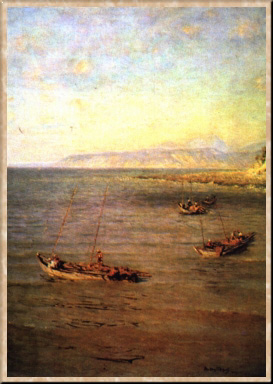 Внезапно высвеченные солнечными лучами грозовые тучи тянутся тяжелой горизонталью, занимающей почти всю верхнюю половину картины, над почерневшей водой, отражаясь в ней. Вдали - темная полоса берега, как бы сдавленная сверху и снизу стихиями неба и воды. Земля теряет свою материальность, но и вода - лишь зеркало для неба. Самым материальным, осязаемым здесь "телом" становятся грозовые тучи - яркие и светоносные.
